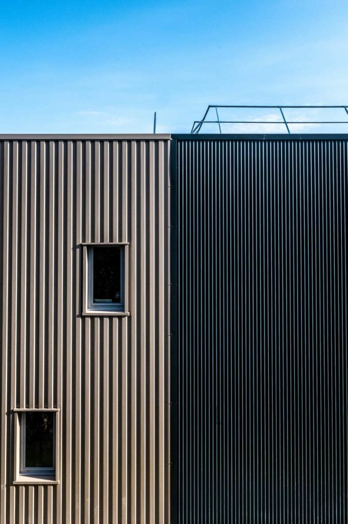 Ce siège social de bureaux situé à Quimper comprend aussi un atelier de découpe et un entrepôt de stockage. Nous avons envisagé ce projet comme 3 pièces de tissus cousues. De la haute couture !
