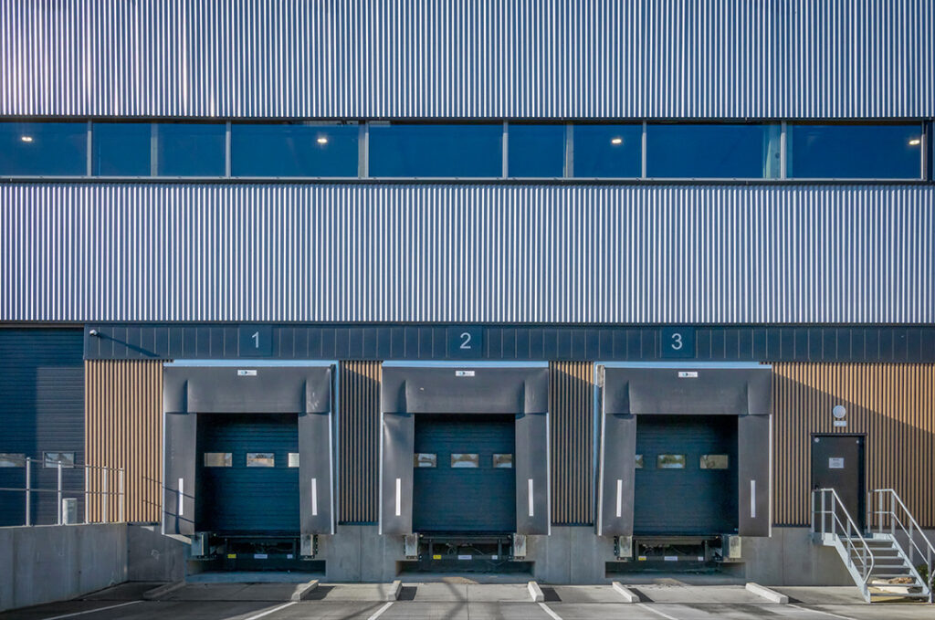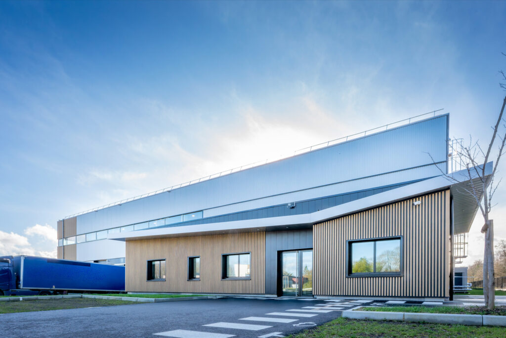 La façade se distingue par une composition rythmée de strates horizontales, soulignées par un bardage métallique à l’aspect bois, qui s’étend avec élégance entre les quais de livraison et les bureaux. Un bandeau vitré,