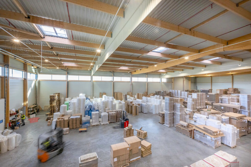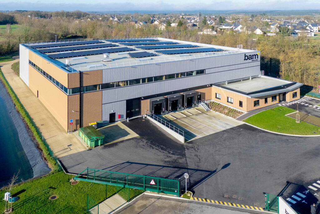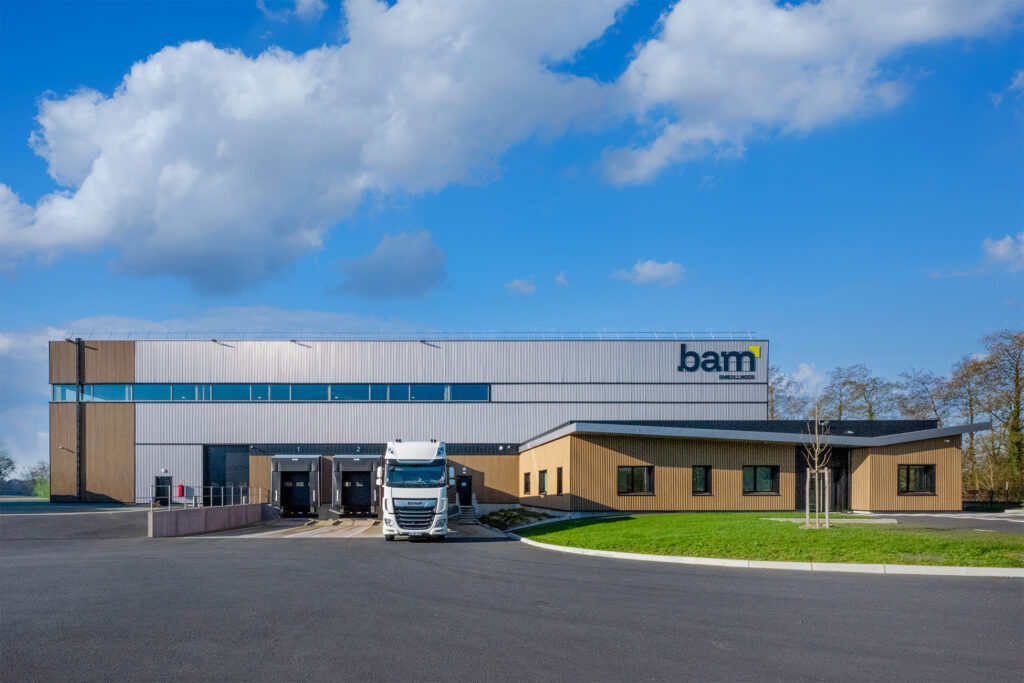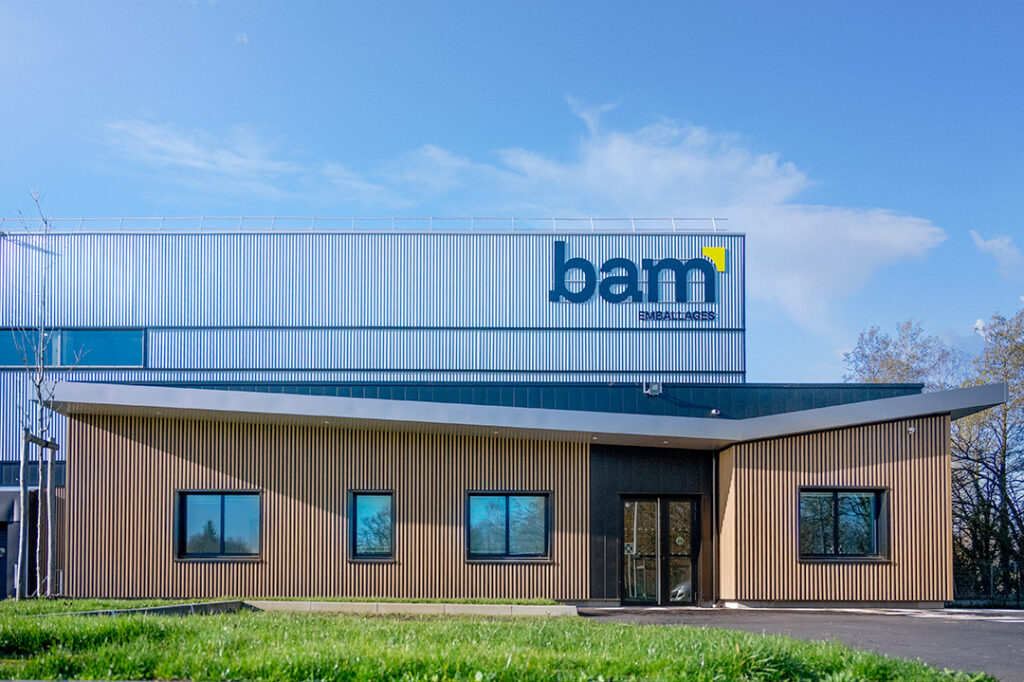 Le site « BAM » se consacre au stockage et à la distribution d’emballages. Conçu selon les normes ICPE, le bâtiment s’inscrit avec soin dans sa parcelle, en prévoyant dès l’origine une possible extension future. Les bureaux, qui accueillent entre douze et quinze employés, sont directement reliés à l’entrepôt, facilitant ainsi les échanges et la circulation.